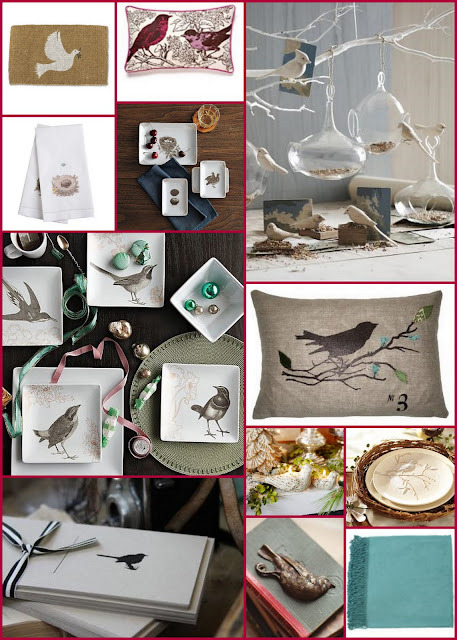 {1} Coconut shell white dove doormat from Wisteria {2) perch pillow by Thomas Paul from Tracery Interiors' online shop {3} Utopia mouth blown bird feeders from My Sparrow {4} Nest and egg hand towels from Wisteria {5} entertain set from West Elm {6} Birds with flowers dessert plates from West Elm {7} No. 3 bird with blue buds applique pillow from my Sparrow {8} Whitewash songbird candles from Pottery Barn {9} Set of 4 Bird Salad Plates from Pottery Barn {10} Recycled bird note card set from My Sparrow {11} Bird at peace paperweight from My Sparrow {12} Robin's egg blue bamboo blanket from Tracery Interiors