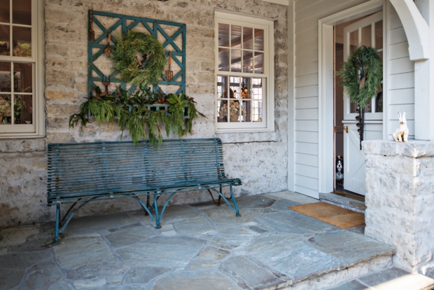 Love, love these glossy black doors adorned with natural evergreen wreaths...notice that the magnolia leaves have been painted gold.